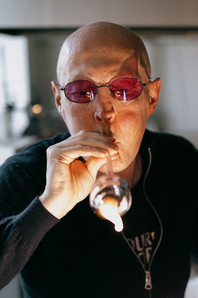 Men det vil kræve, at Chris kan bruge begge hænder. Så han lægger glaskolben fra sig på bordet og slukker brænderen. Dette var til ære for fotografen.