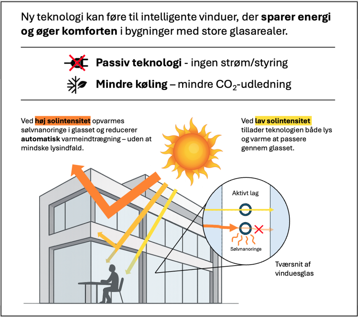 Forskere fra Aarhus Universitet har udviklet et nyt lysfølsomt hybridmateriale, som indlejret i vinduesglas automatisk tilpasser sig solens styrke og regulerer varmeindstråling i bygninger. Teknologien virker uden strøm og elektronik og har potentiale til at mindske energiforbrug og CO₂-udledning fra køling, især i moderne glasbyggeri.